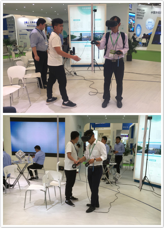 國禎環(huán)保管網(wǎng)事業(yè)部別出心裁,在展臺(tái)中部為觀眾準(zhǔn)備了一場VR盛宴。通過佩戴VR眼鏡、操作智能手柄,大家可以“深入地下”,身臨其境地體驗(yàn)到管網(wǎng)下井作業(yè)的規(guī)范流程,引得觀眾駐足體驗(yàn),樂在其中。