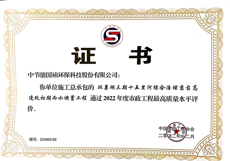 12月27日,“2022年市政工程建設產(chǎn)業(yè)博覽會” 暨中國市政工程最高質(zhì)量水平評價頒獎大會在長沙開幕。中節(jié)能國禎總承包的“京臺高速處初期雨水調(diào)蓄項目”通過2022年度“市政工程最高質(zhì)量水平評價”。同時,我公司作為建設單位的清溪凈水廠PPP項目和胡大郢污水處理廠PPP項目也獲此殊榮。